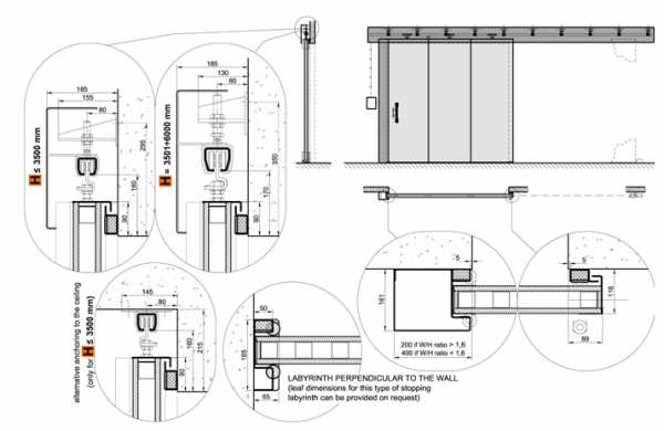 При проектировании учитываются точные размеры и особенности применения. При замерах учитываются геометрические особенности проема, пристальное внимание уделяется выступам, которые могут препятствовать перемещению полотен. Кроме того, важно проверить прочность перекрытий и балок перед установкой, чтобы материал в месте анкерных креплений выдерживал высокие нагрузки.