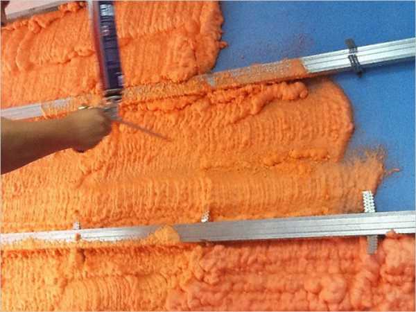 Утеплитель удобнее всего нарезать так: разложить на полу лист ДВП, раскатать по нему минеральную вату, отмерить и с силой провести острым канцелярским ножом.