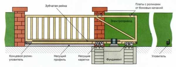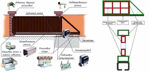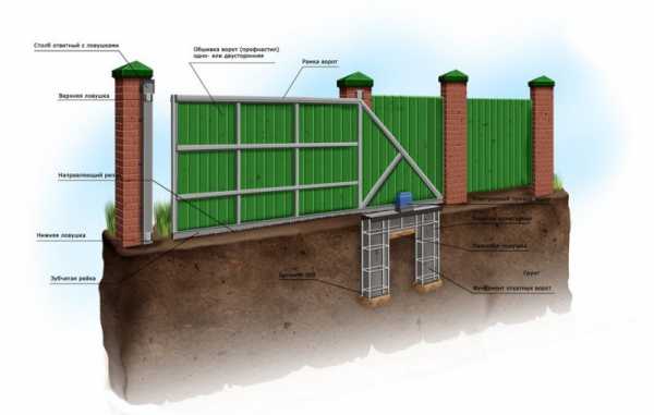 На поверхности земли оборудуется специальный рельс или профиль, по которому створка будет передвигаться с помощью специальных роликов. В верхней части также устанавливаются роликовые элементы и дополнительные скобы, которые будут придерживать полотно при передвижении.