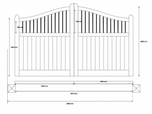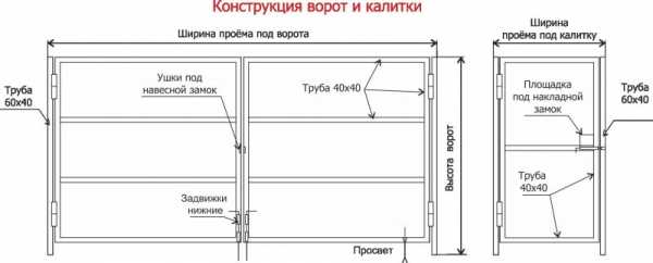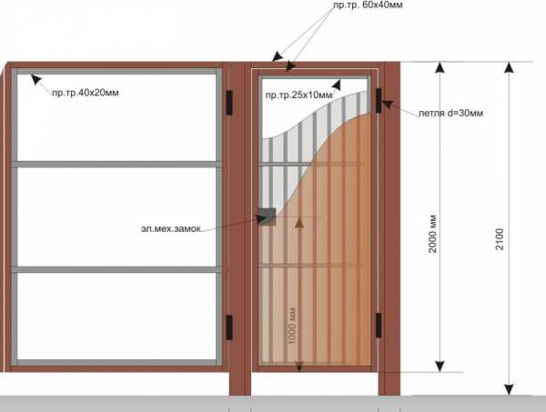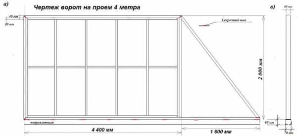 Сами створки выполняются из труб с квадратным сечением, но меньшего размера. Рекомендуемые габариты 40х25х3000 мм. С помощью сварки изготавливают каркас створок в виде обычных рамок и затем усиливают поперечинами или диагоналями из того же материала. Обязательно нужно предусмотреть на створках места для засовов, замков и ограничителей открывания-закрывания.