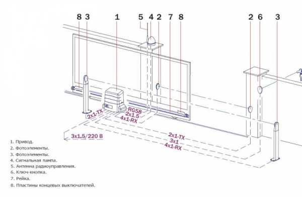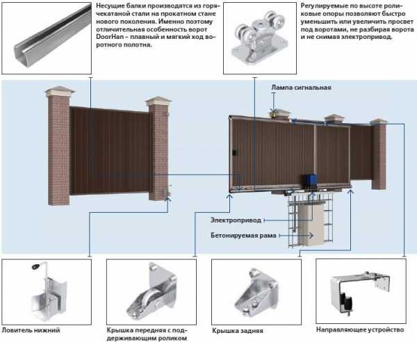 Стандартный комплект элементов для установки раздвижных консольных ворот включает:
