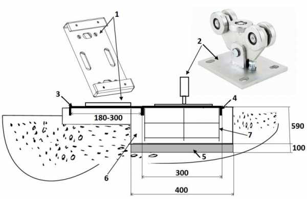 Для оборудования фундамента понадобится подготовить швеллер, который будет равен длине консольной части створки. Также стоит выкопать котлован, в который будет залит бетонный раствор. Длина ямы должна на несколько десятков сантиметров превышать длину швеллера. Фундамент заливается на глубину ниже уровня промерзания грунта. Кроме того, чтобы надежно закрепить швеллер в фундаменте, понадобится выполнить специальный арматурный каркас.
