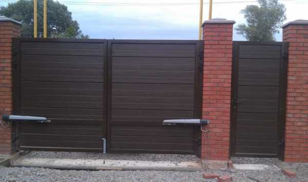 Самым простым и довольно удобным считается вариант распашных ворот со встроенной калиткой. Подобную схему чаще всего используют при обустройстве ограждений для частного дома ввиду простоты конструкции и возможности установки своими руками.