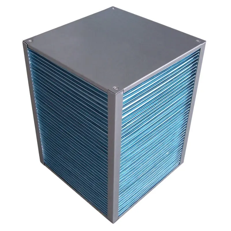 Пластинчатые представляют собой блок-кассету с металлическим корпусом, внутри которого установлены пластины (отсюда название) из оцинковки, фольги, пластика или полимеризованной бумаги. Пластины разделяют потоки воздуха и мешают им смешиваться. Эффективность данного вида рекуператоров зависит от материала пластин:
