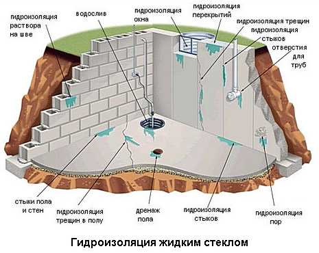 Смесь для гидроизоляции – 1 часть жидкого стекла + 9 частей цементного раствора.