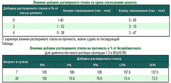 На практике — не рекомендуется вводить более 5 % жидкого силикатного стекла. Превышение пропорции делает бетон трудноукладываемым, существует риск его застывания прямо в емкости. Эта добавка в большом количестве приводит к ухудшению прочностных характеристик цементного раствора. Для часто используемой цементно-песчаной смеси в пропорции 1:3 и с соотношением В/Ц = 0,58 падение прочности, в сравнении с бездобавочными, составляет: