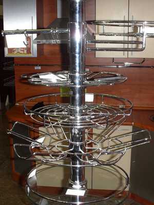 Центральные полки крепятся на рейлинг посередине и располагаются вокруг него. Они могут быть металлические или стеклянные. Функционал у них самый разнообразный. Всё зависит от формы. Есть разновидность для хранения шести бутылок, например. Они лежат солнышком вокруг рейки. Есть полочка с держателем для хранения бокалов. Также полки могут иметь ровное дно и обладать высокими или низкими бортиками. Эти аксессуары можно использовать для хранения фруктов, сладостей, приправ и всяческих мелочей.- Боковые полки крепятся к перекладине при помощи поворотной ручки. На таких креплениях могут находиться полки или вешалки, по необходимости. Также бывают модели, прикреплённые к рейлингу так, что полка крутится вокруг него.