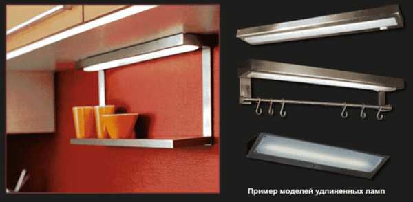 - Основные устройства для освещения рабочей поверхности и кухонного гарнитура: