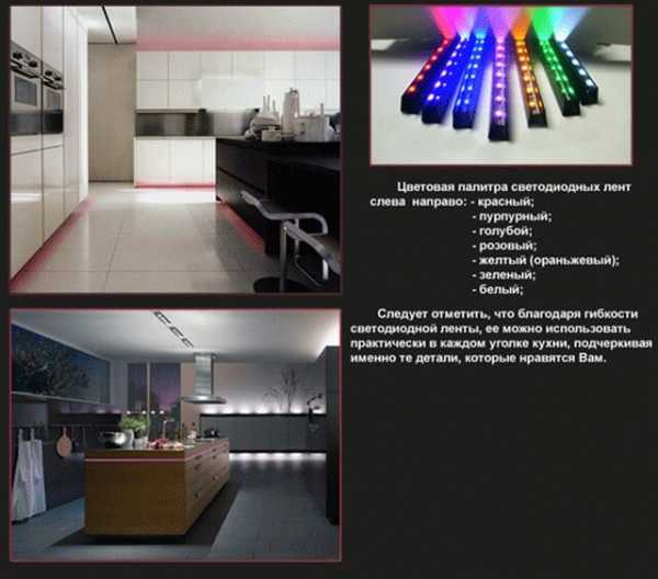 - использование светодиодных лент придает особое своеобразие оформлению помещения, так как они могут размещаться в любой части кухни и мебели, обладают различными цветовыми оттенками, укрепляются по периметру или ширине шкафов.