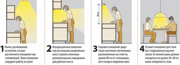 Лучше всего производить подсветку встраиваемыми либо малогабаритными приборами. Так как пространство довольно ограничено, и излишние выступающие предметы будут только мешать работе.