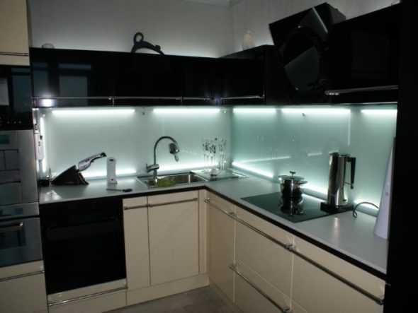 - достаточно просторную кухню лучше всего подсвечивать лампами разных цветовых оттенков; при этом на гарнитур можно приклеить светодиодную ленту, как поверху, так и по нижнему краю;