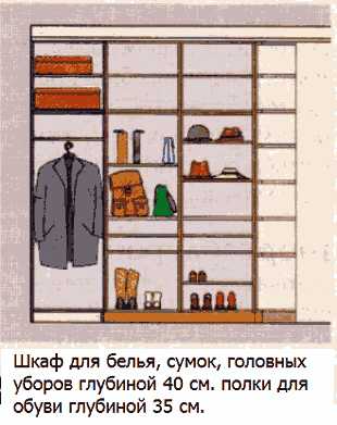 Шкафы для белья, головных уборов, сумок делают глубиной 40 см.