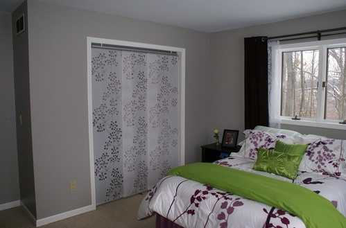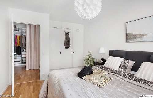 - Отдайте предпочтение раздвижной двери, двери-гармошке или арке со шторой для входа в гардеробную. Две обычные двери на одну небольшую спальню — это слишком много.
