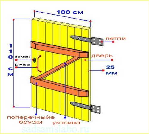 По аналогичной методике изготавливается каркасная дверь – внутреннее пространство дополнительно укрепляется брусьями. Но перед началом работы проводятся точные расчеты, подготавливается чертеж.