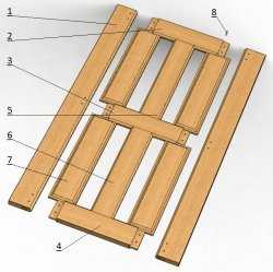Для выполнения конструкции понадобятся 2 продольных доски, которые будут расположены в длину изделия и иметь размеры 192 см. Затем изготавливают 4 поперечных доски длиной 72 см.