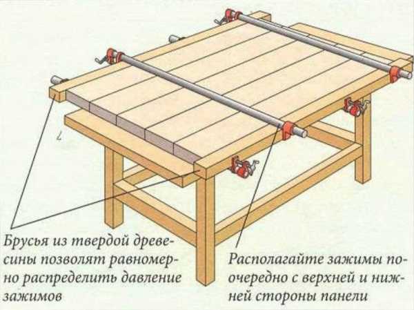 Работа производится на поверхности большой площади. Собранное покрытие поджимается струбцинами. Если щит высох, его обрабатывают фрезером. Чтобы была хорошая звукоизоляция, рекомендуется собрать щит из нескольких слоев досок. Полученная конструкция зажимается струбцинами.