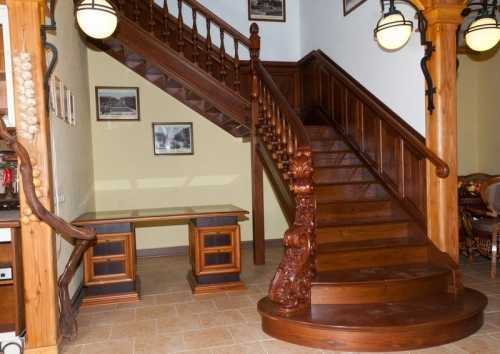Красивая деревянная лестница на второй этаж с плавным поворотом