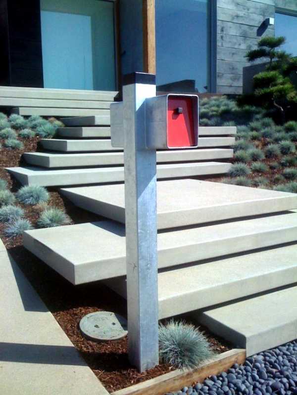 Врезанная в земляной склон лестница из бетонных плит не имеет подступенков, за счет чего выглядит по-современному облегченной. Выразительный антураж она приобрела благодаря использованию плит разного размера, смещенных относительно друг друга.