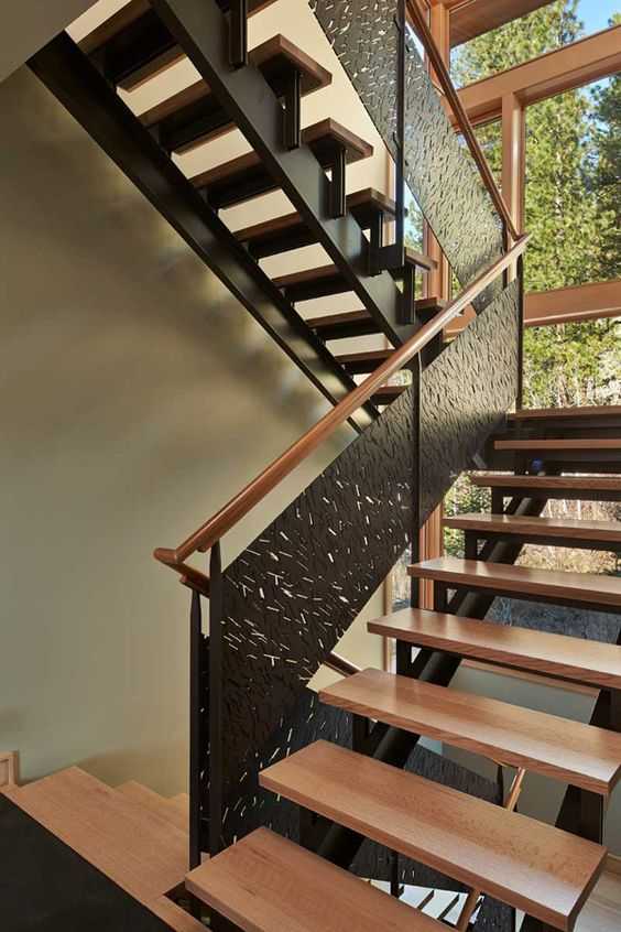 Для баланса условно «теплых» и «холодных» материалов в дизайне лестниц дерево нередко комбинируют с металлом. На фото вы видите винтовую лестницу в стиле лофт с массивными деревянными ступенями и спиралевидным ограждающим экраном из черненой стали, которая, несмотря на свой индустриальный вид, смотрится очень даже по-домашнему.