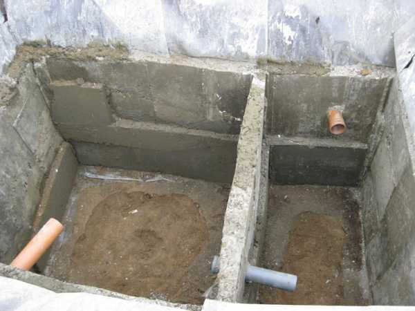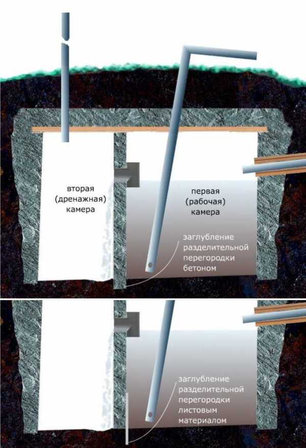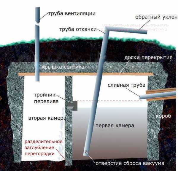 Делается технический люк диаметром 1м, вокруг которого устанавливают опалубку. Нужно сделать два отверстия над камерами и вставить трубы. В основную камеру – труба диаметром 100 мм и обратным уклоном для откачивания ила, которая не доходит до дна на 20 см. На конце такой трубы делается отверстие сброса вакуума. Во вторую вставляется вентиляционная труба диаметром 50 мм.- Заливается перекрытие толщиной минимум 15 см с обязательным добавлением камня и штыкованием. После затвердения септик укрывается гидроизоляцией и его можно полностью засыпать землей, оставив только технический люк. Чтобы зимой септик не промерзал через этот люк, его закрывают пенопластом и накрывают еще одной крышкой.