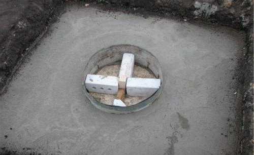 - В опалубку заливают бетон вперемешку со щебнем и камнями разного размера, а саму смесь штыкуют, убирая пузыри воздуха. Труба и тройник заливаются так, чтобы после снятия опалубки вокруг них была монолитная стена.