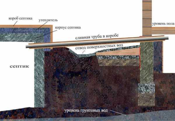Обязательно нужно учитывать направление грунтовых и паводковых вод – они не должны идти от септика к дому или скважине. При этом устраивать септик в нижней части участка тоже нежелательно – талые и стоковые воды будут заливать его. Чтобы защитить септик от затопления или поднять над уровнем грунтовых вод, его можно не закапывать полностью в землю, утеплив надземную часть для предотвращения замерзания.