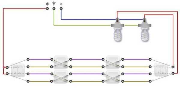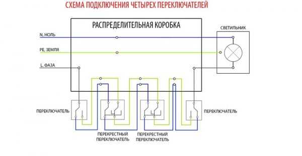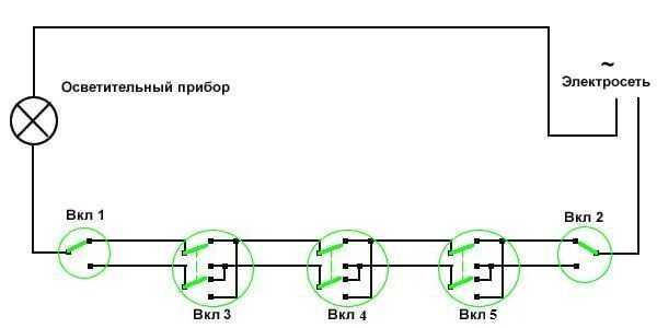 Схема подключения проходных выключателей на 5 точек