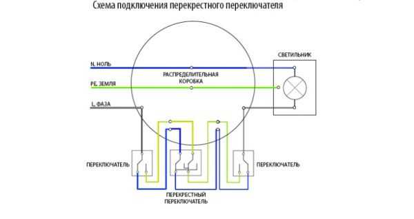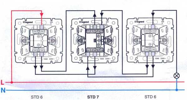 Схема подключения проходного выключателя для управления светильником из 3-х мест