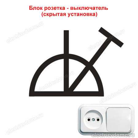 Для большего удобства в помещениях розетки и выключатели устанавливаются не отдельно друг от друга, а в блоке. Его, например, можно использовать для управления электричеством и освещением в санузлах. Он также нуждается в особом схематическом обозначении. Любой блок в чертеже будет иметь основу в виде полукруга, от основания которого отходят линии и пересекают поверхность окружности: