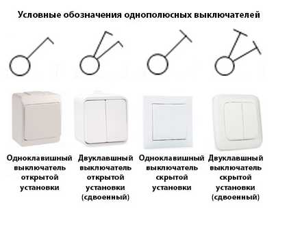 Все типы выключателей имеют схематическое изображение в виде окружности с чертой в верхней части. Окружность с чёрточкой, содержащей крючок на конце, обозначает одноклавишный выключатель освещения открытой установки (степень защиты IP20 — IP23). Два крючка на конце чёрточки означают двухклавишный выключатель, три — трёхклавишный.