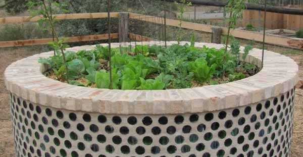 7. Ограждения для высокой грядки из подручных материалов. Можно сделать бортики грядок из бутылок, уложенных как кирпичи на бетонный раствор.