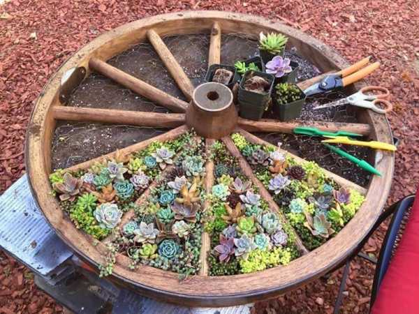 Грядка-колесо имеет небольшую площадь, подходит для выращивания специй. Колесо от телеги (автомобильные диски и покрышки) заглубляют в землю, добавляют плодородный грунт. Грядка для рассады готова.