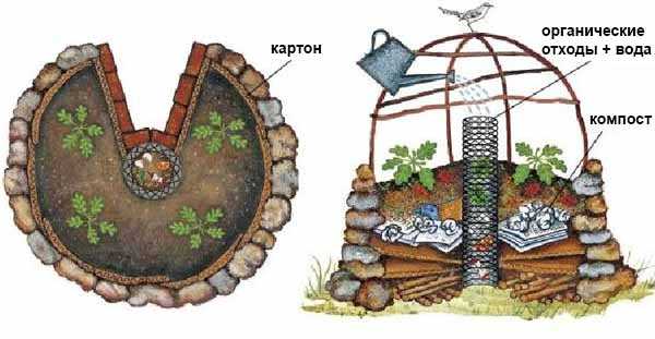 Не рекомендуется выкладывать на дно деревянный настил. Вполне достаточно армированной сетки, покрытой старыми газетами. Для лучшего дренажа добавляют крупные куски кирпича, потом — слой различных пищевых отходов, скорлупы, перепревшего навоза с соломой и 10–20 см качественной садовой земли (слои не перемешивать!). Обильный полив даст усадку, а повышенная температура почвы простимулирует корневую систему. Пересыхания грунта допускать нельзя.