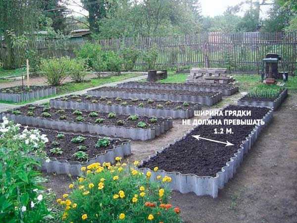 При строительстве шифер придется углублять в землю на 10-20 см, ширина грядки может варьироваться в пределах 20-120 см, длина зависит от желания огородника и размера участка.