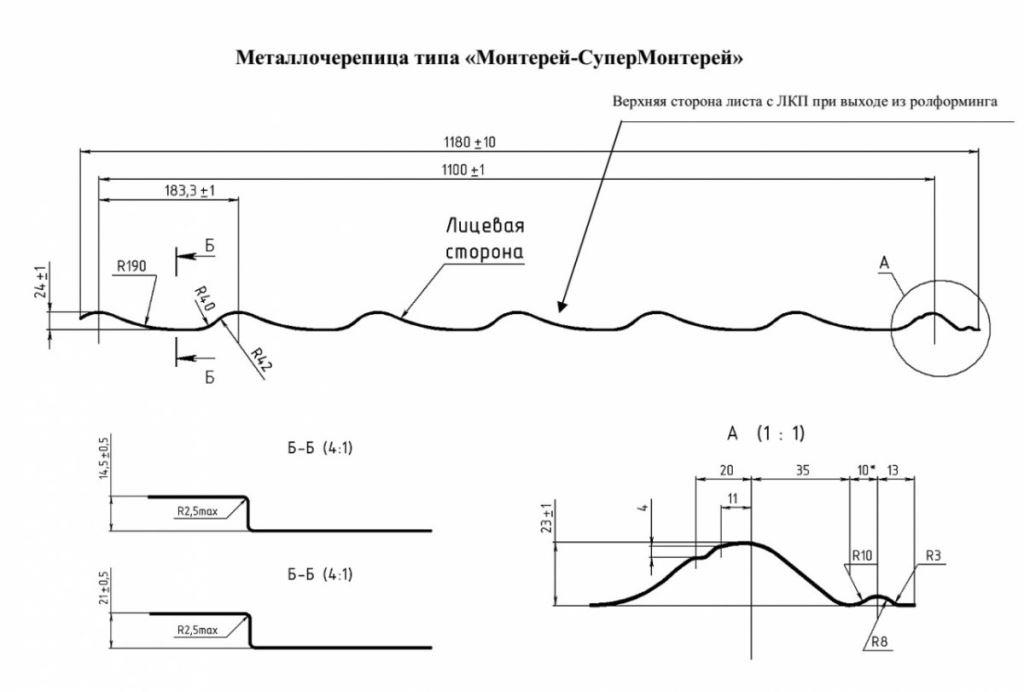 При выборе всегда обращают внимание на размеры листа металлочерепицы Монтеррей и на тип профиля.