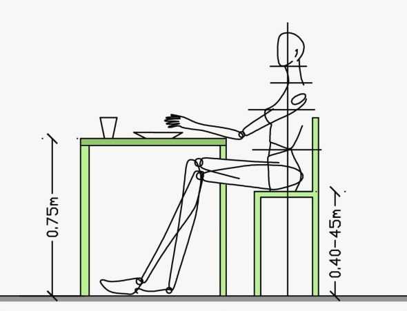- Необходимо правильно подобрать высоту обеденного стола, причем она рассчитывается для каждого конкретного случая.
