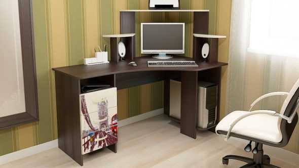 Конструкция стола удобно встраивается в угол помещения. При этом пользователь усаживается либо в диагональ стола и перпендикулярно монитору, либо лицом к основной длине стола и в полуоборот к экрану.