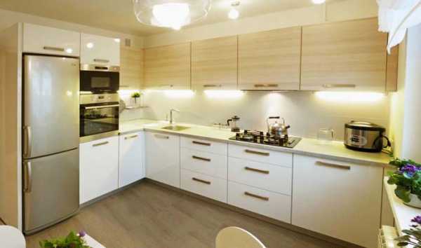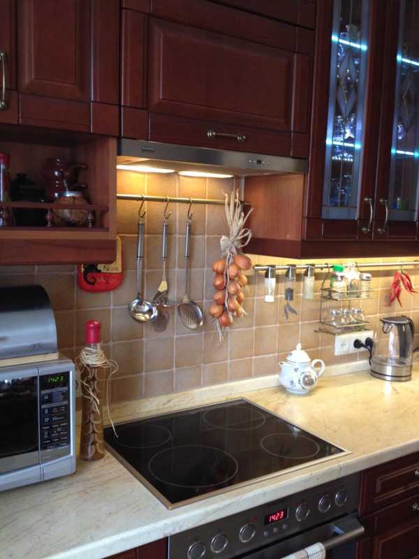 Освещения на кухне должно быть достаточно, это обычно основной свет и свет на рабочей зоне (используют точечные светильники). Если есть вытяжка, то нет необходимости монтировать светильники над плитой, так как лампы, которая есть в вытяжке достаточно для освещения зоны. Плюс к этому освещение без вытяжки будет быстро загрязняться, что усложняет уход за кухней.