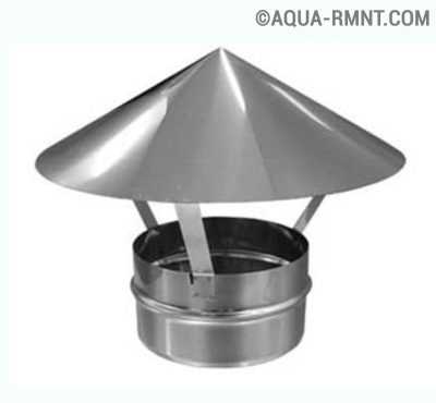 - Закрепите в верхней части вытяжной магистрали колпак, предохраняющий трубу от попадания осадков и способствующий усилению тяги.