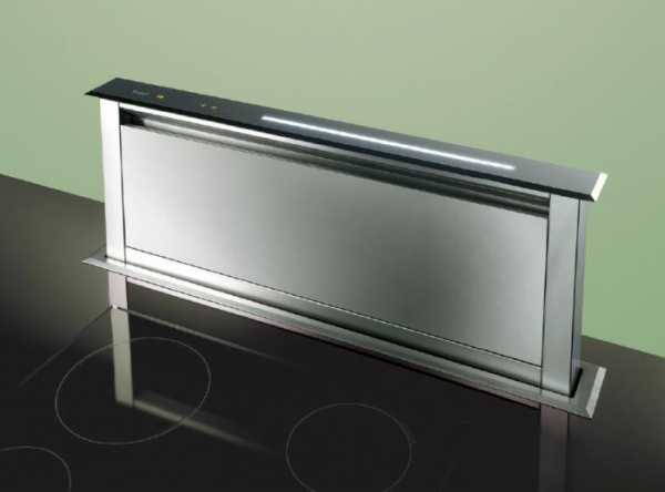 - Встраиваемые (конструкции с выдвижной нижней панелью). Такие вытяжные системы встраивают в навесные шкафы кухонных гарнитуров или столешницы. Они компактны, красивы, могут иметь множество дополнительных функций. Это более дорогие модели, чем классические подвесные, но дизайн, многофункциональность, удобство эксплуатации в полной мере оправдывают цену.