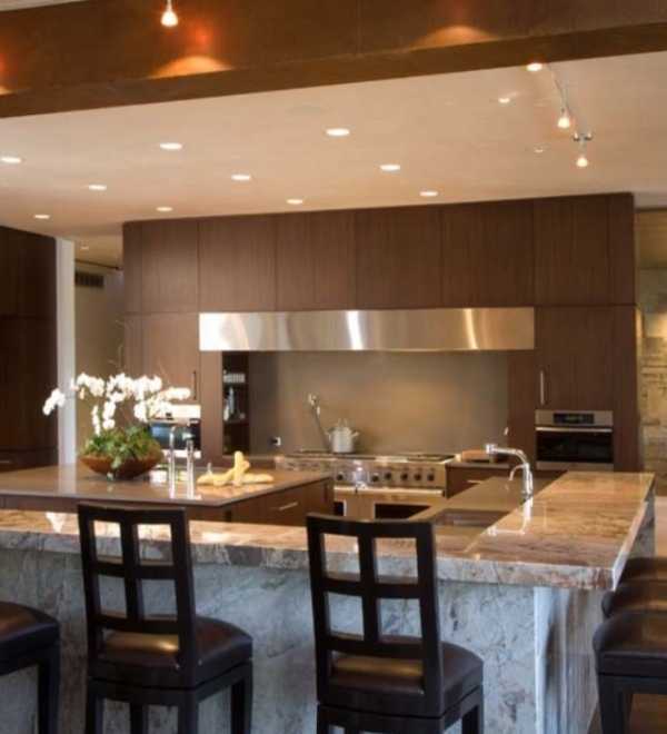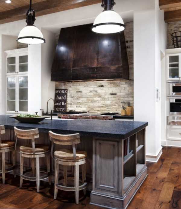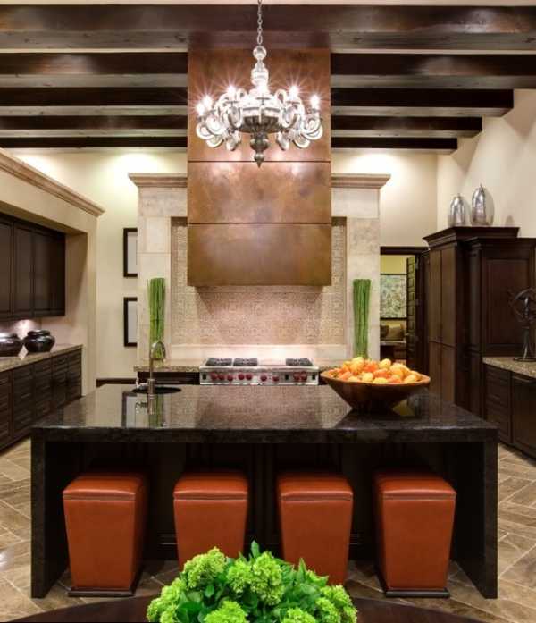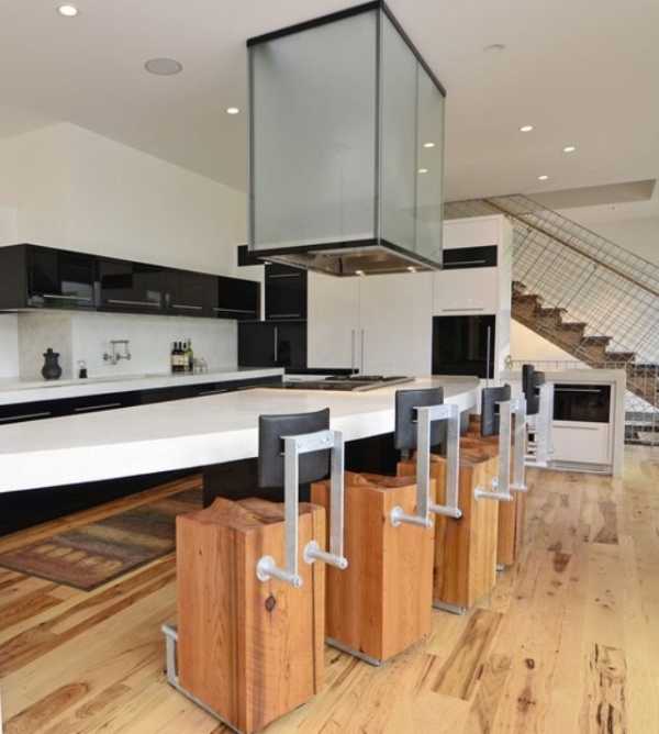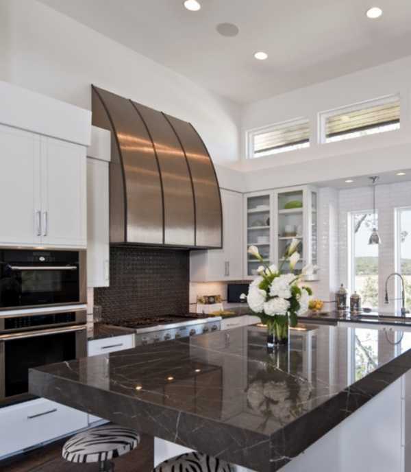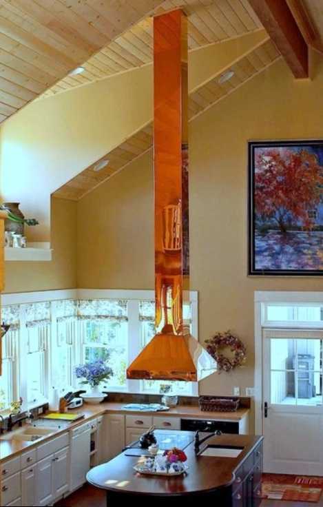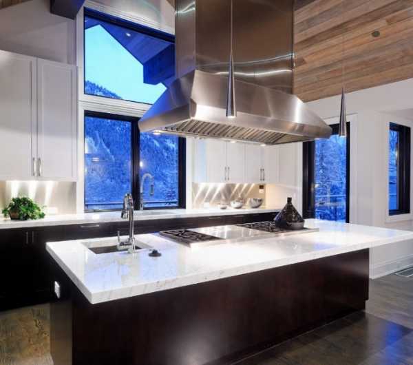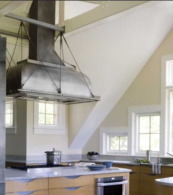 - Островные. Это мощные вытяжные системы, предназначенные для помещений большой площади. Они способны очистить воздух не только в кухне, но и в соседних комнатах. Их можно крепить в любом месте, в т.ч. и посередине потолка. Модели универсальны, подходят для островной или полуостровной планировки кухни. При выборе стоит обратить внимание на дополнительные функции.