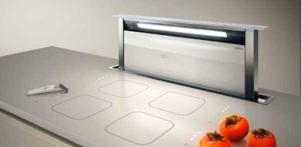 - Панели, встраиваемые в столешницу. Такой вариант подходит для гарнитуров с вмонтированной варочной поверхностью. Алгоритм очистки здесь простой: в панели есть специальные створки, которые автоматически открываются и втягивают испарения еще до того, как те поднимутся вверх. Таким образом, запахи не распространяются по комнате, несмотря на скромные размеры самой вытяжки.