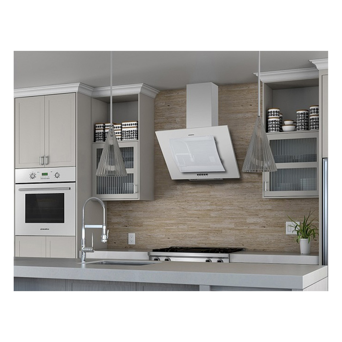 Здесь мы видим стену, отделанную в матово-фиолетовй цвет, а если точнее, то это оттенок дымчатой орхидеи. На его фоне очень ярко выделяется светлая модель наклонной вытяжки. Иногда производитель делает какую-нибудь графику или предоставляет возможность ее сделать. Для многих это является ключевым моментом.