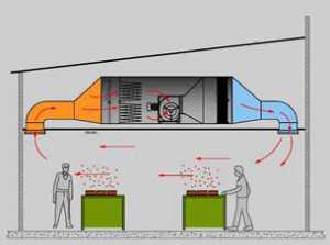 Если технологические процессы предполагает постоянное локальное перемещение рабочих по всей площади цеха, то организация мобильных постов с местной вентиляцией теряет свою актуальность. В этом случае целесообразно организовать вентиляцию общеобменного типа. Как правило, такая вытяжка затрагивает нижнюю и верхнюю часть помещения, а принудительные потоки дополнительно обеспечивают и обогрев помещения, что особенно актуально для сварочных работ в холодное время года.