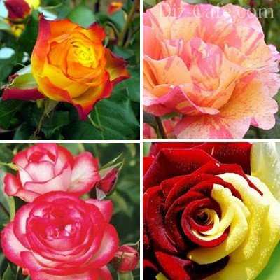 Розы с двухцветными цветками всегда смотрятся особо празднично и нарядно. Наиболее красивые сорта среди них: Kleine Rosel с фиолетово-красными цветками, украшенными желтыми тычинками, American Pillar с розовой бахромой, General Testard и Evangeline с красными краями