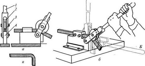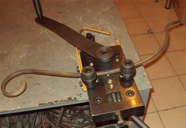 Чтобы качественно сформировать угол в изделии производимом методом холодной ковки, вам понадобится станок под названием «гнутик». Он состоит из стальной пластины с подвижным упором на которых находятся два опорных вала и рычаг.