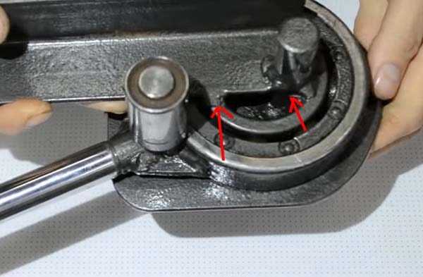 Заготовка помещается между клином и опорными валами. После этого, с помощью рычага происходит смещение клина по направлению к валам, что приводит к изгибу заготовки.