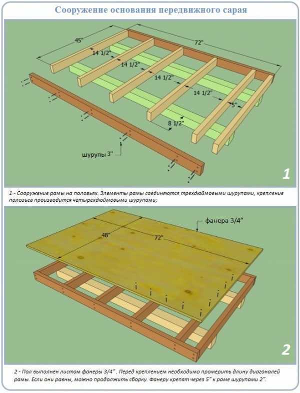 С целью периодической транспортировки строение устанавливается на полозья из бруса. Если идея мобильности не увлекает, сарай в зависимости от свойств подстилающих грунтов опирается на поверхностную ж/б плиту или на мелко-заглубленные бетонные блоки, расположенные под углами постройки.
