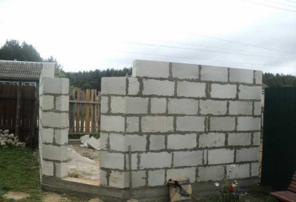 Внимание! Блоки или кирпичи нижнего ряда обязательно кладут на слой гидроизоляции. Ленточный фундамент накрывают слоем рубероида или обмазывают битумной мастикой, чтобы влага из бетона не попадала на стены сарая.В соответствии с чертежом постройки выкладывают стены, выполняя оконные и дверные проемы. Коробка хозяйственной постройки из пеноблоков готова.
