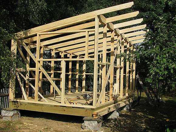 Союз экономии с результатом возможен, если строить своими руками. Для этого нужно знать, как сооружается каркасный сарай с односкатной крышей – самый доступный для неопытного исполнителя вариант.